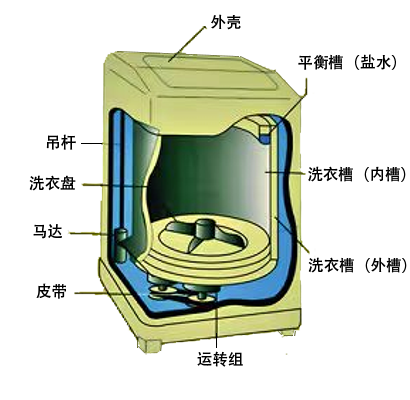 洗衣機主要由外殼(金屬鐵或塑料)、內膽、電機、控水開關、定時器、電容器、控制主板和排水閥等零部件組成,材質構成有塑料、銅、鐵、鋁等再生資源。