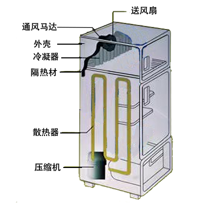 電冰箱主要由外殼(金屬鐵或塑料)、保溫層泡棉、壓縮機、銅管、電容器、燈管、儲物籃等零部件組成,材質構成有玻璃、塑料、銅、鐵、鋁等再生資源。